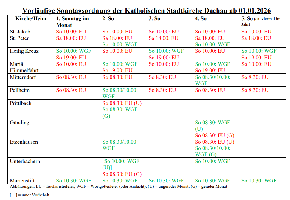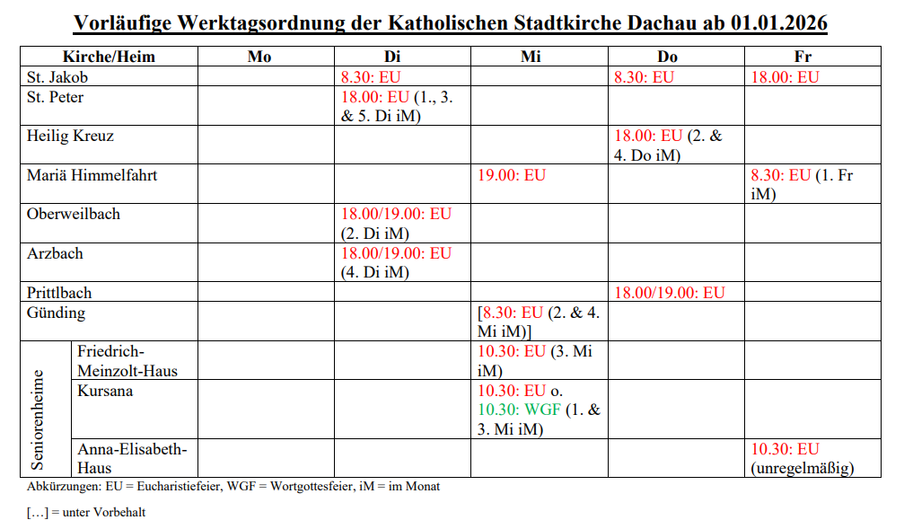 Die vorläufige Sonntags- und Werktagsordnung der Katholischen Stadtkirche Dachau ab 01.01.2026 finden Sie ebenfalls in den Schaukästen unserer Kirchen!
